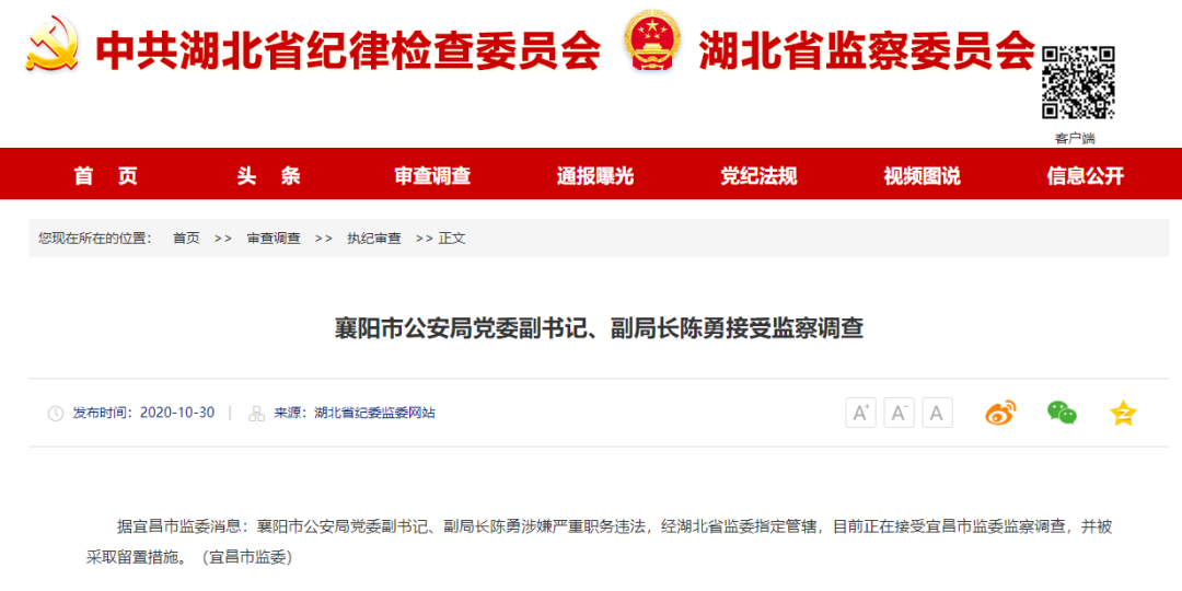 据宜昌市监委消息:襄阳市公安局党委副书记、副局长陈勇涉嫌严重职务违法,经湖北省监委指定管辖,目前正在接受宜昌市监委监察调查,并被采取留置措施。(宜昌市监委) 来源:湖北省纪委监委网站 (责任编辑 黄静蕾) 责任编辑 黄静蕾