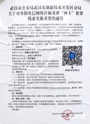 为有效防范和打击电信网络诈骗犯罪和整治涉及“两卡”(手机卡、物联卡、个人银行卡、对公账户及结算卡、非银行支付机构账户等)违法犯罪活动,从11月1日起,武汉市公安局武汉东湖新技术开发区分局对辖区内举报电信网络诈骗及涉“两卡”犯罪线索破案实施重奖。
