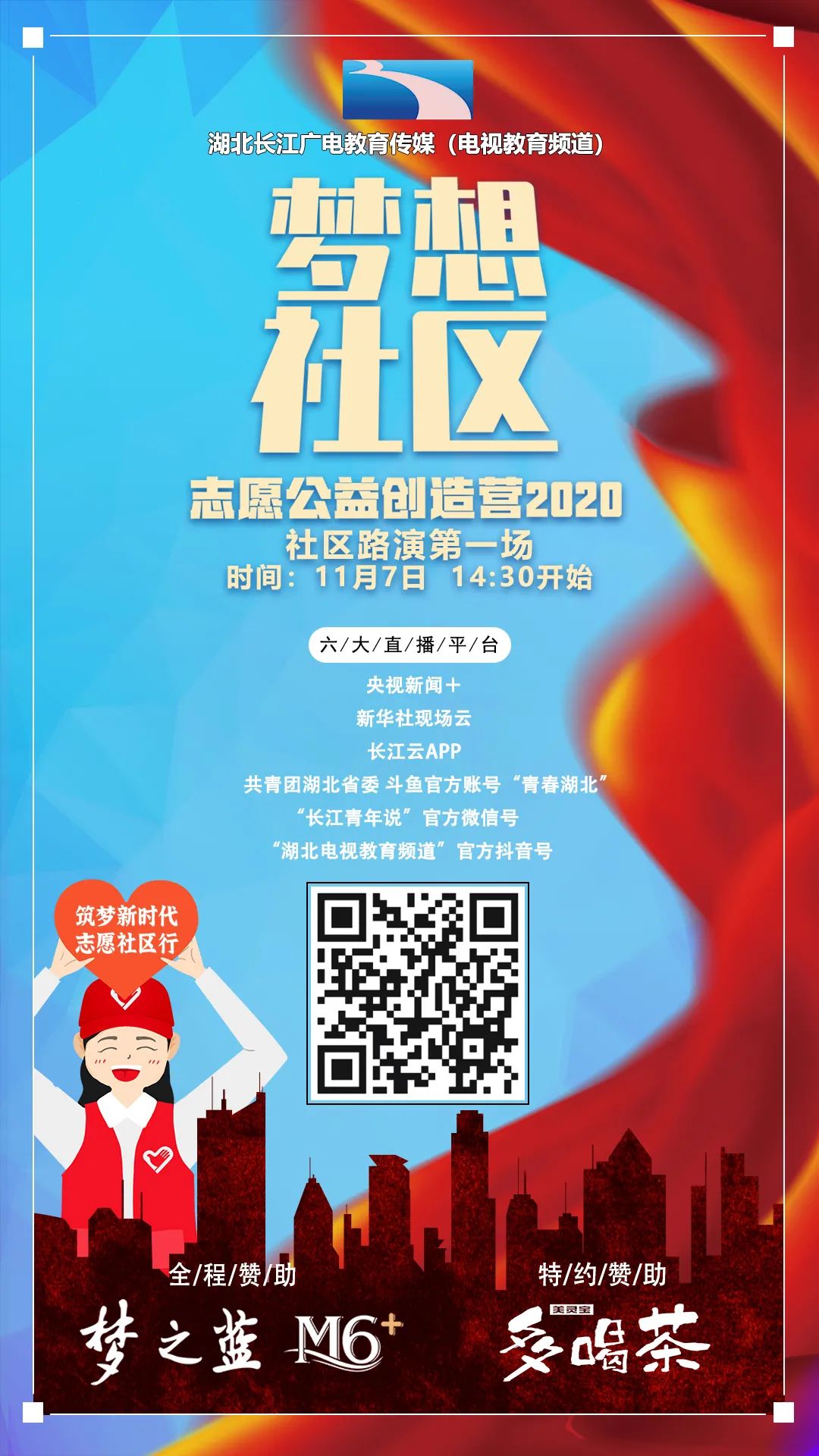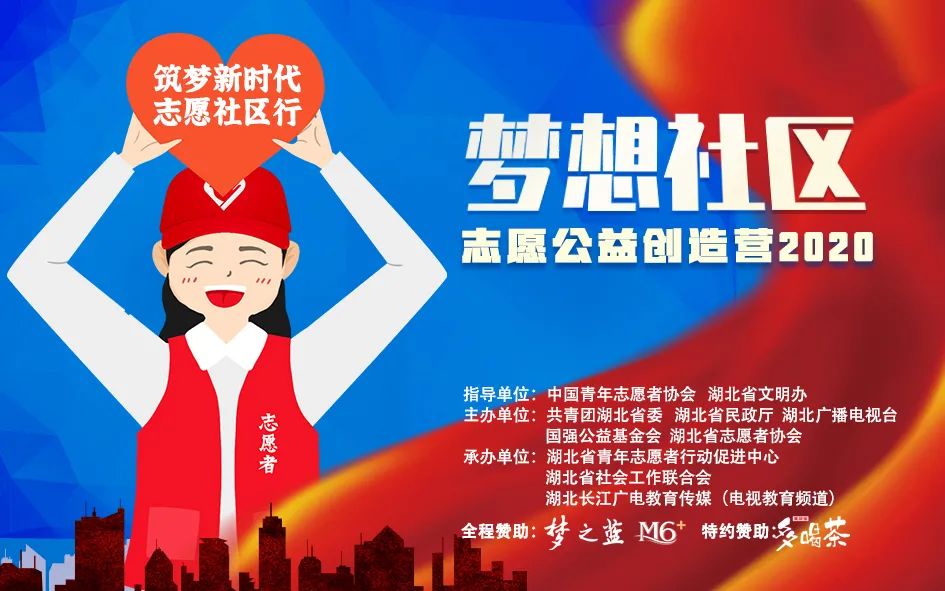“梦想社区——志愿公益创造营2020”,是在中国青年志愿者协会、湖北省文明办指导下,由共青团湖北省委、湖北省民政厅、湖北广播电视台、国强公益基金会、湖北省志愿者协会主办,湖北省青年志愿者行动促进中心、湖北省社会工作联合会、湖北长江广电教育传媒(电视教育频道)承办的活动。