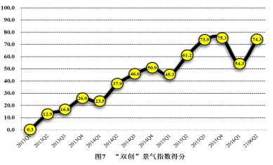 在此基础上,我们收集了2013年以来上述指标数据,结合大数据分析方法,对近年来我国“双创”景气指数进行了测算,结果显示:近年来,我国迎来新一波创业创新浪潮。2013-2015年,“双创”景气指数持续攀升,2015年第三季度达到阶段性峰值,为75.3分。今年以来,我国创业创新进入调整,一季度“双创”景气指数降到54.3分,二季度提高到74.3分,呈现回升的态势(图7)。