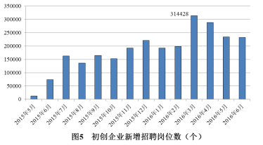 创业带动就业情况是衡量创业成效的重要指标。同时,这个指标也能够反映“双创”形势的好坏,当创业创新形势好的时候,创业企业招人就多,反之就少。据对全国248个城市初创企业的招聘需求信息统计,去年以来我国初创企业用人需求快速上升。今年3月新增招聘岗位达到31.44万个,6月份为23.2万个,比去年同期增长213%(图5)。