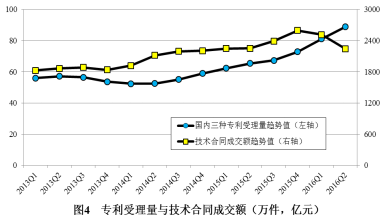 科学研究、技术发明和转移转化是创业的重要基础和支撑。同时,创业也会加速科技成果转化,促进创新发展。因此,专利和技术转移是衡量“双创”发展的重要指标。据国家知识产权局统计,2016年一季度国内三种专利申请量为594146件,同比增长35.7%,继续呈现高速增长的态势(图4)。技术合同成交金额1570.9亿元,同比增长12.9%。其中,技术服务合同增长明显,电子信息技术、现代交通和城市建设领域持续成为三大热门领域,涉及知识产权的技术合同额占总成交金额的57.0%。