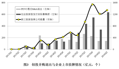 并购与上市是反映创业企业成长状况的指标。一般而言,创业企业发展要经过种子期、初创期、成长期和成熟期几个阶段。创业企业被收购,或实现新三板挂牌和IPO,是创业成功的重要标志。据万德(Wind)数据库统计显示,2016年一季度,VC/PE通过并购退出额为145.79亿元,延续了2015年下半年以来的下降趋势,但二季度开始企稳,上半年VC/PE通过并购退出金额达291.59亿元,与去年同期基本持平。