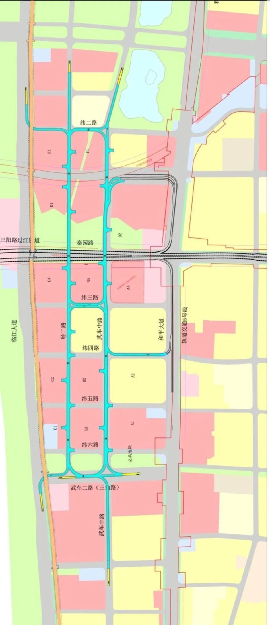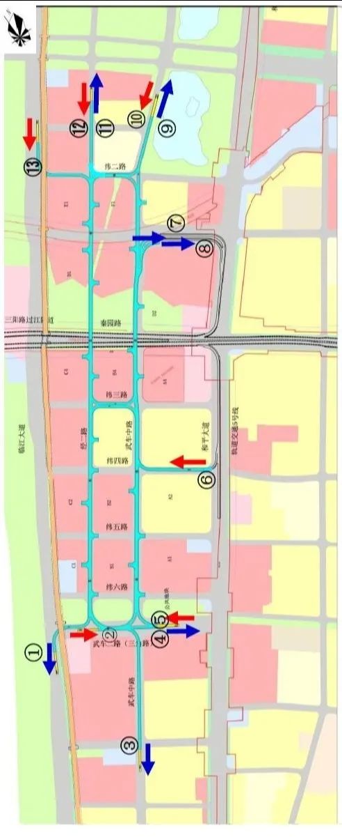 武昌滨江核心区地下空间环路匝道分布图(蓝色代表出,红色代表进)。