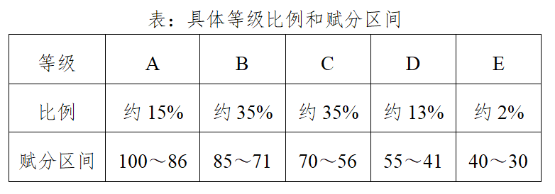 第二步,将A至E五个等级内的考生原始分,依照等比例转换法则,分别转换到100~86、85~71、70~56、55~41和40~30五个分数区间,得到考生的等级分。等级分计算结果按“四舍五入”进行处理,以整数呈现。