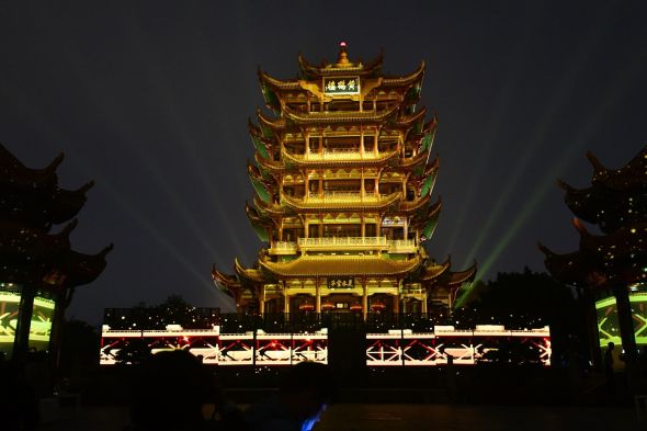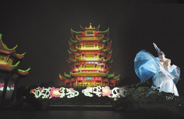 黄鹤楼夜游通过动画、激光等艺术和科技,将夜间黄鹤楼公园的山体、池水、楼阁、亭台、长廊“活化”,融入真人实景演艺。游客边走边看,穿行在一幅幅光影的历史画卷中,观看黄鹤楼的“前世今生”,感受时光荏苒背后的故事。