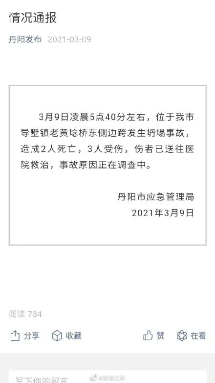 3月9日凌晨5点40分左右,位于江苏省丹阳市导墅镇的老黄埝桥东侧边跨发生坍塌事故,造成2人死亡,3人受伤。