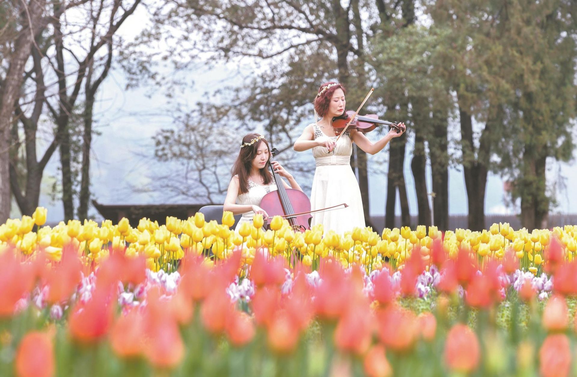 昨日,中科院武汉植物园内,眼下最鲜亮盛艳的当属郁金香和山茶。60万株郁金香、风信子、洋水仙等球根花卉家族浓妆登场,红黄粉紫白,点缀草坪,倒映湖面,园内随处可见炫彩之姿。
