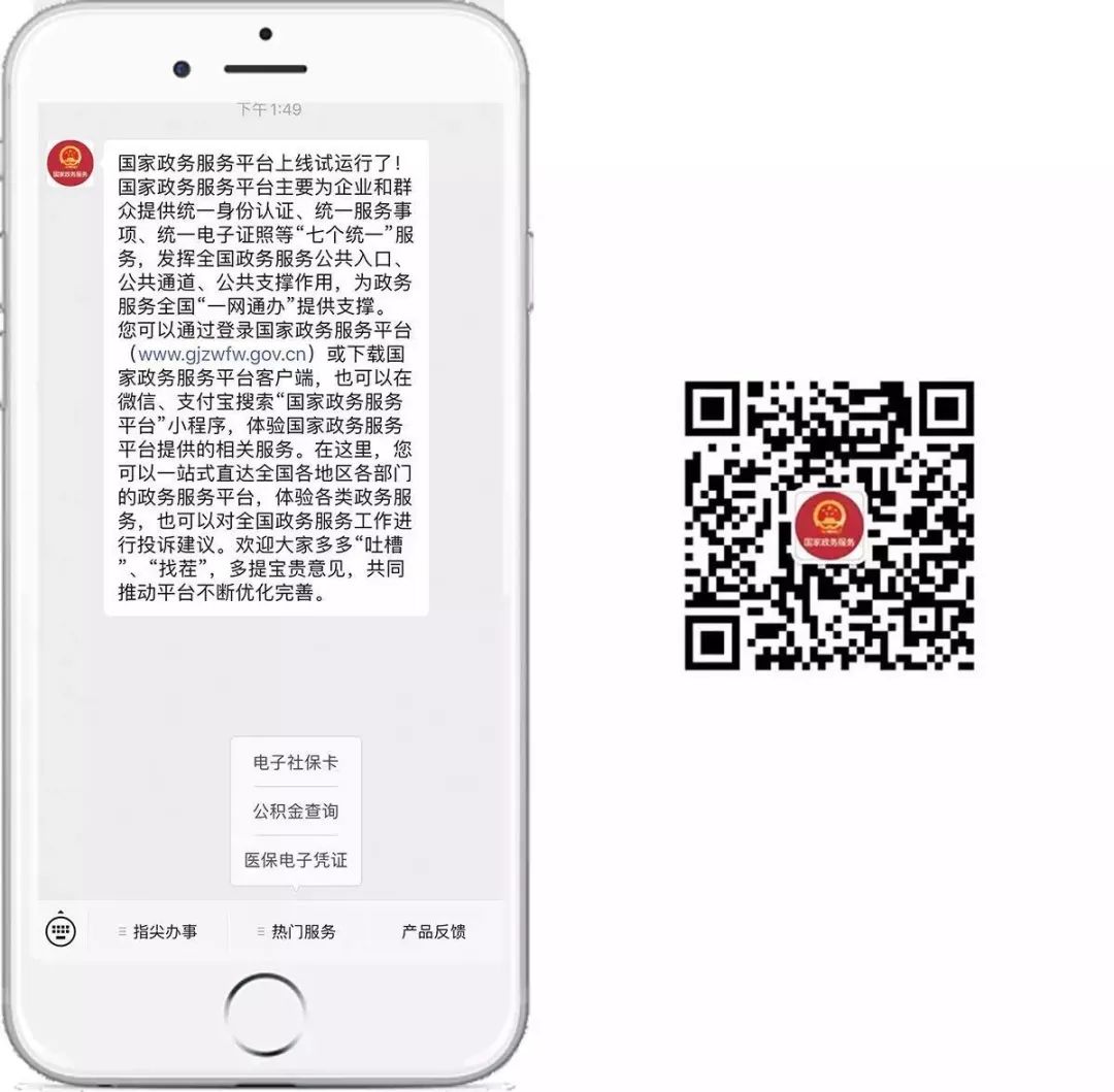 步骤一:扫码并关注“国家政务服务平台”微信公众号,点击菜单栏“热门服务”-“电子社保卡”即可进入服务。