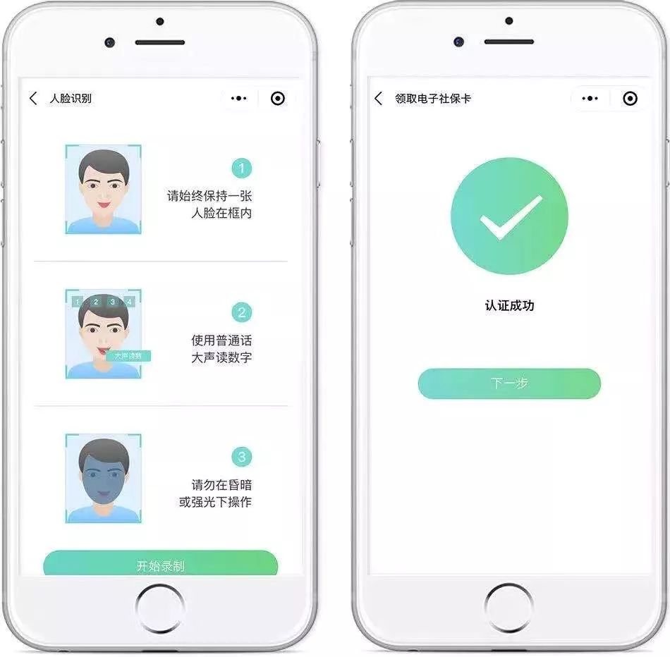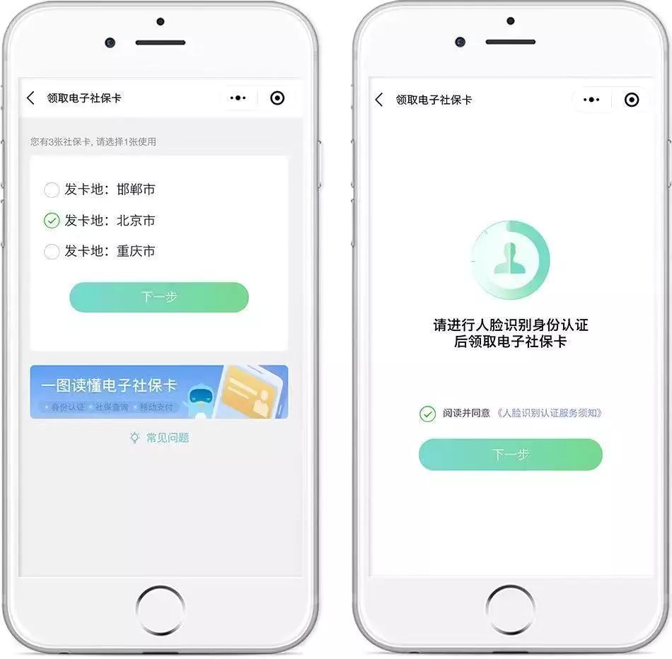 步骤二:选择一张实体社保卡进行关联,点击下一步根据提示进行认证,第一次登录需要通过人脸识别身份认证领取电子社保卡。