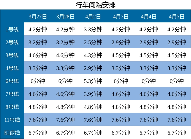 4月4日至4月5日,轨道交通 1、2、3、4、6、7、8、11号线运营时间为6:30至23:00,阳逻线运营时间为6:30至22:30。