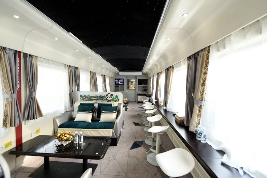 “熊猫专列”更加注重人性化服务配置,紧急呼叫按钮、智能服务系统、观景长桌、点歌、影音娱乐等一应俱全,还有无线网络(含5G信号)全覆盖。