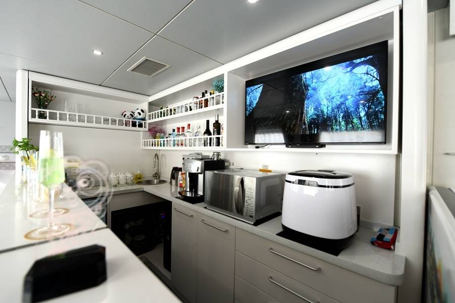 根据旅客需要,“熊猫餐车”也可化身为“移动”的会议室,旅客在休憩之余,可尽览沿途美好风光,放松心情。