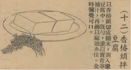 民国年间的鲜香椿吃法,注重“简洁生美”。1920年3月,上海消闲文艺型报纸《新世界》登出“香椿头烧豆腐”菜谱:“取香椿如掌大之叶,切成细末置碗中。更取水豆腐切成条状,入油锅灼之。待外面生皮,即酌加水及酱油、盐、白糖,煮之约十余分钟,即将香椿细末倾入,拌数下盛皿中。香甜可口!”