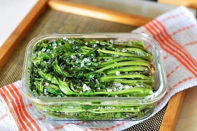 鉴于此,明清至民国的有心之人善用多种方式保存鲜香椿。清人丁宜农学专书《农圃便览》完整保存了“腌香椿芽”的制作工艺:“香椿芽取肥嫩者浸腌器内过宿。次日取揉,每日三次。至五日后看芽俱透,置屋内晾半干,入镡炒炉焙之。十余日取晾一次,否则坏烂,至白露后便不用晾。”相形之下,华北的腌香椿工艺简化了许多,且用上了腌制品常见的伴侣——盐。光绪《顺天府志》记载,明清时期北京地区的居民乐于制作盐渍香椿,方法是“香椿头,今土人腌藏之,名咸香椿。”