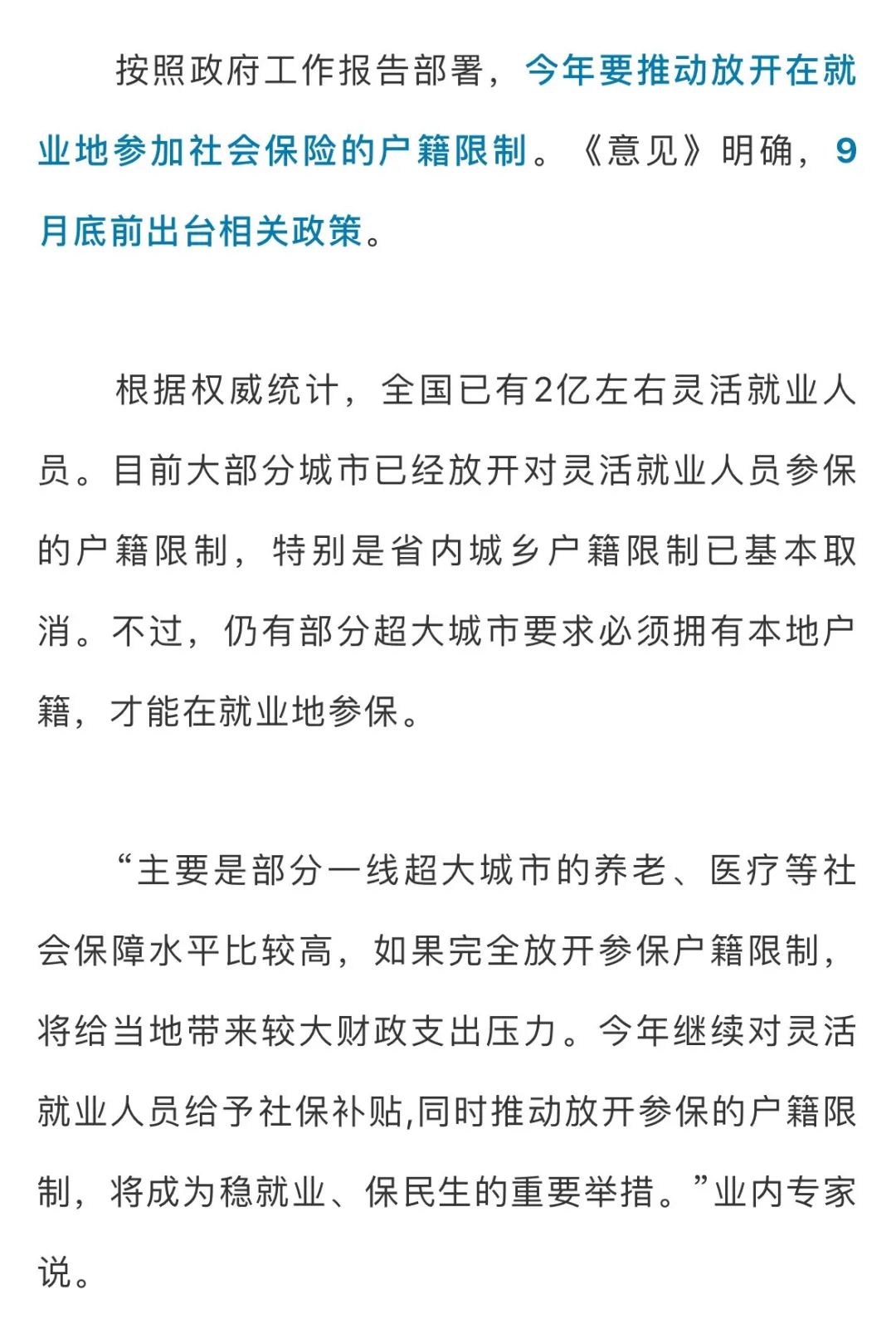 放开就业地参保户籍限制,9月底前推出