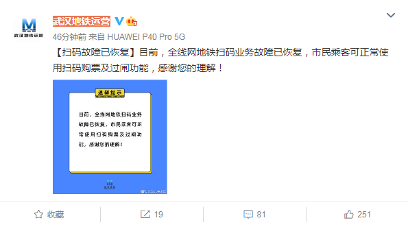 晚上21:22分,武汉地铁官方微博发布扫码故障恢复消息: