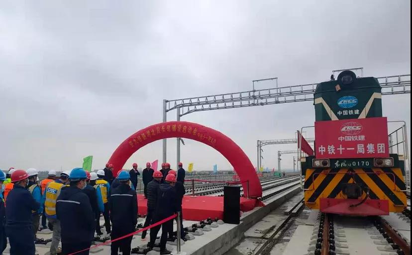 今天(4月8日),湖北省黄梅县安九高铁湖北段孔垄北站施工现场,第一对500米长轨在牵引车的引导下,稳稳落入无砟道床上的承轨槽内,标志着安九高铁湖北段进入铺轨阶段。