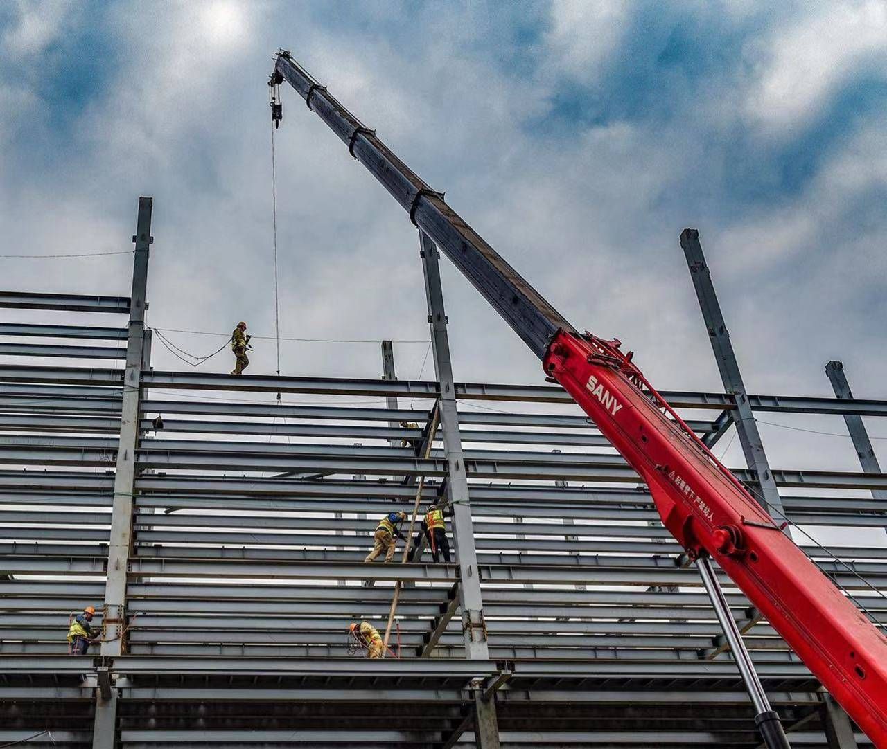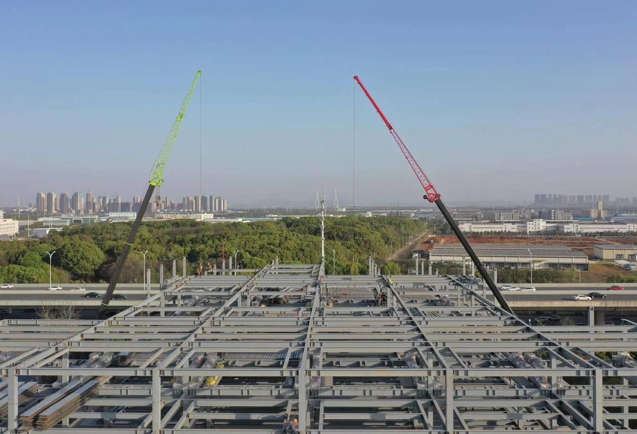智慧立体停车库是湖北省重点建设项目武汉经开区人工智能科技园项目的重要配套工程。智慧立体停车库去年11月开工后,项目部集中设备、人员和材料,合理组织,科学施工,仅用22天就完成161根工程桩的施工。通过对基础复杂节点进行技术攻关,大大加快了基础施工进度。其后,项目部根据现有受限场地,科学布置6台吊车同时进行吊装作业。所有参建人员放弃元旦和春节休假,连续施工,仅用4个月就完成3229吨钢结构吊装作业,完成产值4000万元。