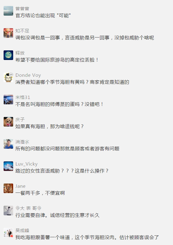 据三亚发布官微消息,2021年4月10日,新浪认证用户[点时视频]发微博称:游客李先生在三亚市某景区饭店点的海胆蒸蛋没见到海胆,龙虾被调包及价格过高,在与商家理论后,受到服务员语言威胁,因受惊报警后由警察护送至酒店,质疑该店欺客宰客。发现该网络投诉后,三亚市高度重视,当即成立由公安、市场监管、旅游监管、综合执法等部门组成的工作组开展调查。