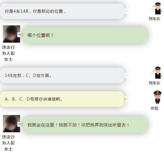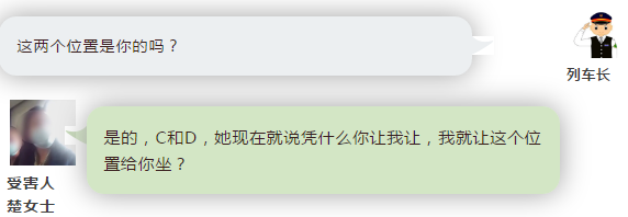 到达现场后,我了解到,16时许,列车在应城站发车之后,一对夫妇持14车厢14C、14D车票在车厢寻找座位时,发现一女子霸占其14D座位。在该夫妇与列车工作人员多次请求下,该女子仍拒不出让座位,并且态度蛮横。