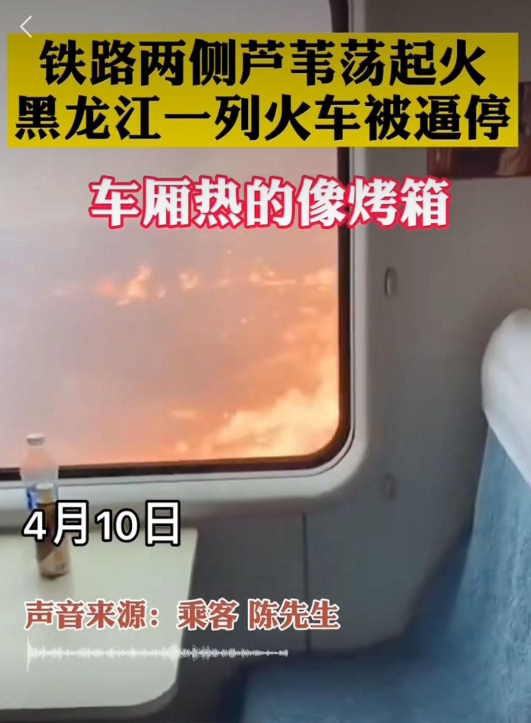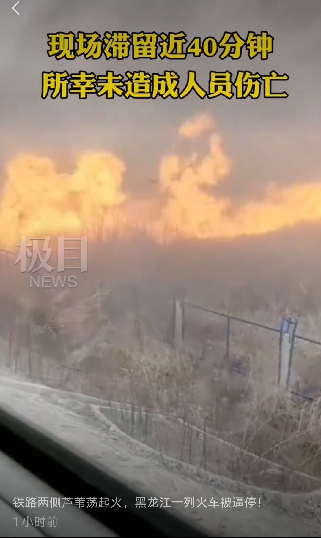 4月10日15时08分,由黑龙江依安开出的K382次列车行至齐北线82公里处北大荒集团富裕牧场有限公司境内,遇铁路附近废弃苇塘火情,造成列车停车46分钟。
