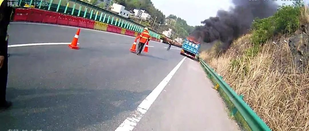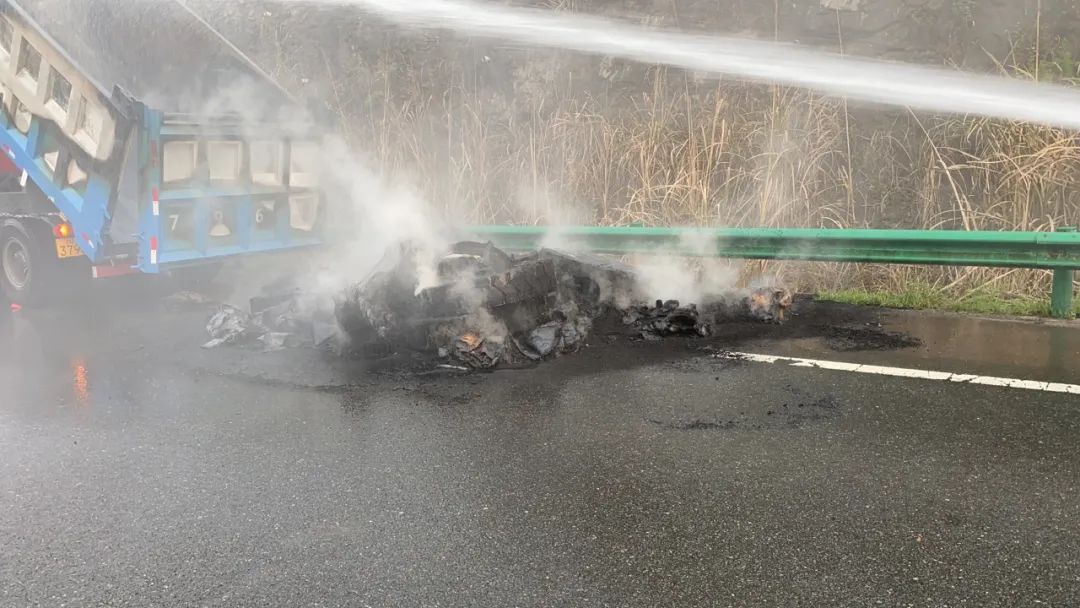 到达现场后民警进行现场管制,并将车辆人员转移至安全区域,随后消防部门对车辆进行了灭火工作。