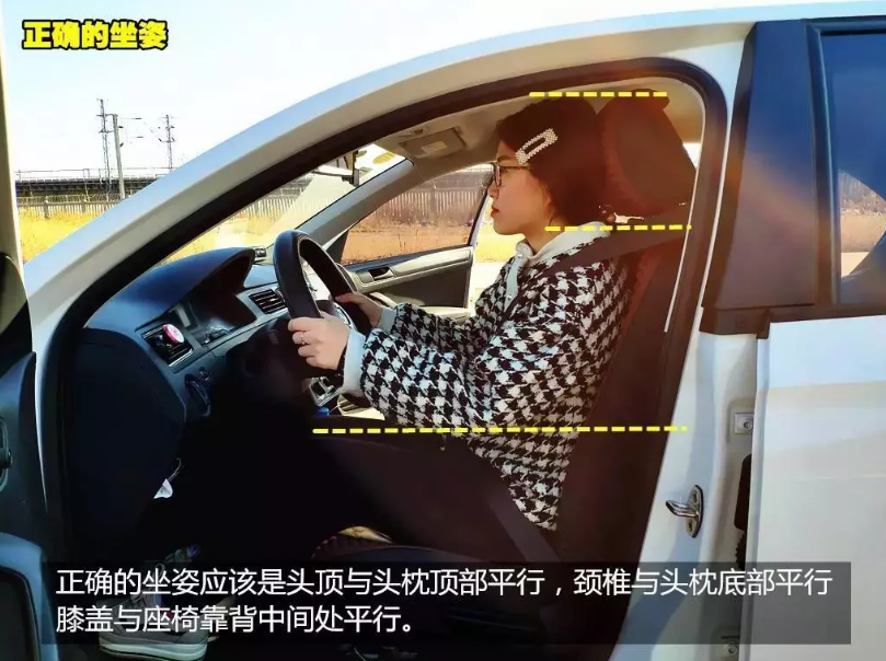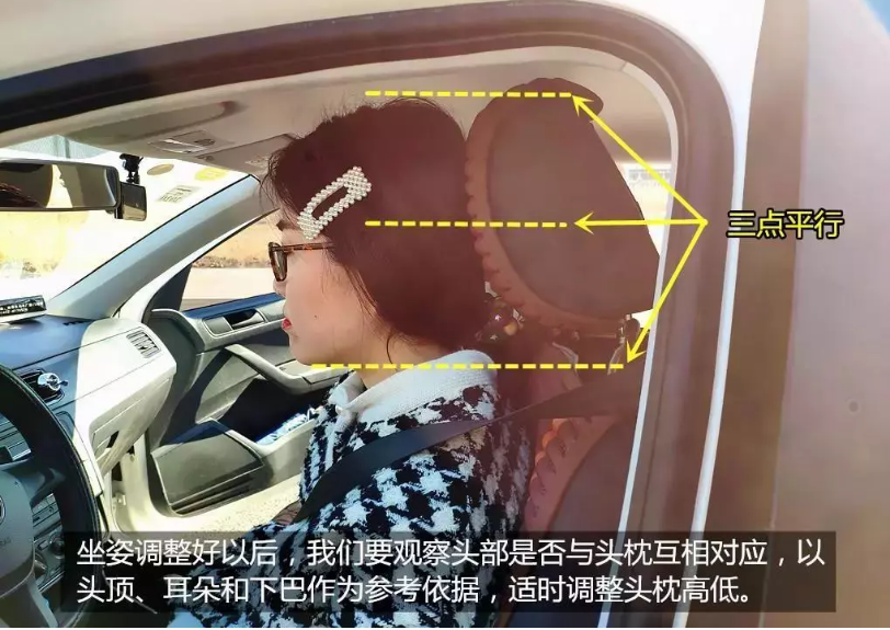 首先我们进入车内以后要以正确的坐姿为第一步,之后我们就要观察头部、颈椎、背部与座椅头枕的相对位置是否平行。