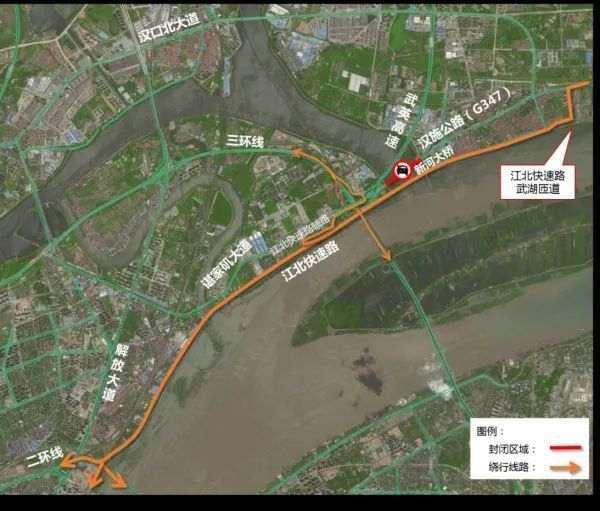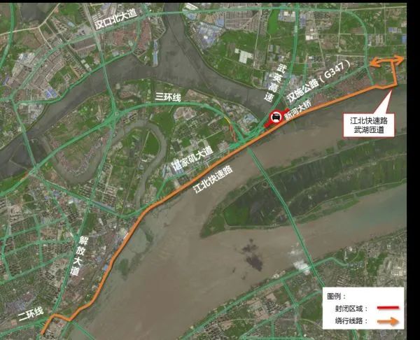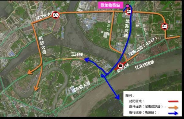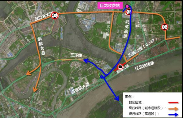 原经汉施公路、新河大桥,由武湖往江岸方向的进城车辆,可通过黄武公路或梅教街,经汉口北大道、巨龙收费站绕行武英高速、三环线进入市区;或直接通过汉口北大道(限高4米),绕行解放大道、三环线进入市区。