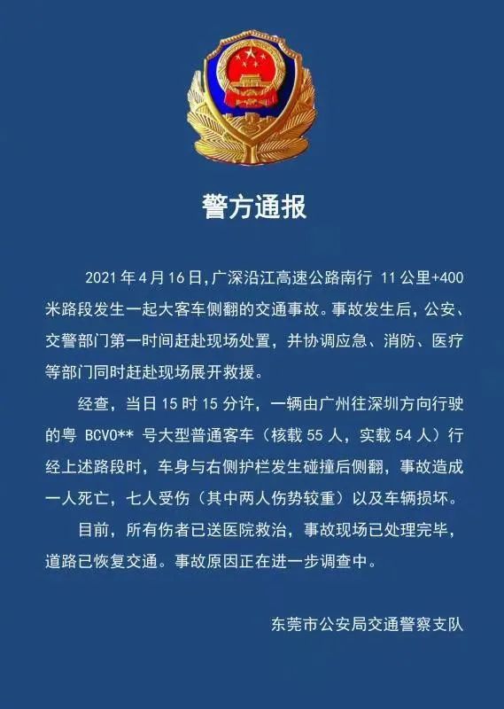 4月16日下午3时许,广深沿江高速公路东莞境内一路段,一辆载有54人的大客车侧翻,致1人死亡,7人受伤。目前,事故原因正在进一步调查中。