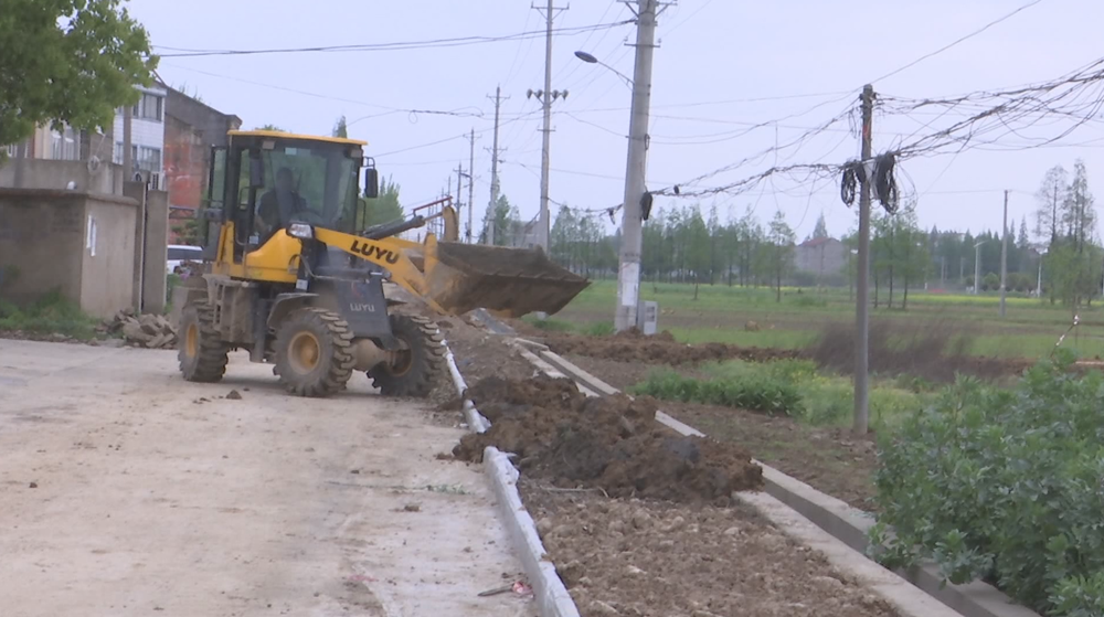 在城关镇大周村的主干道上,两台小型挖土机正在进行填土作业,道路一侧的绿化带建设和沟渠硬化主体工程已基本完成。