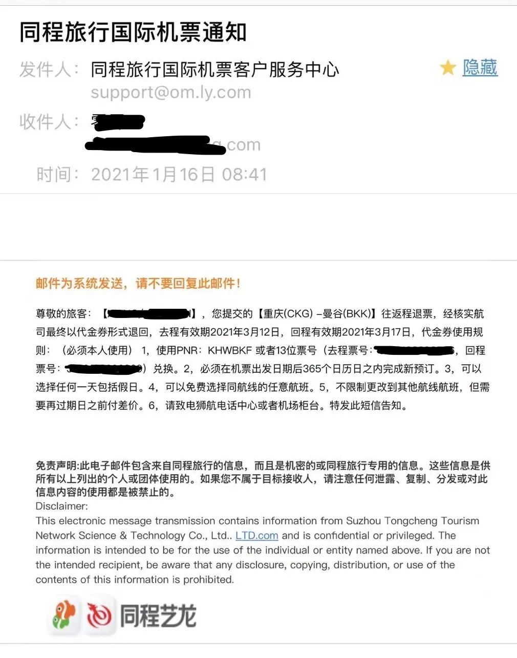 湖北张女士和32名朋友去年1月在同程旅行购买了从重庆往返泰国的机票,后因疫情防控需要不能出行,在平台申请退票后,只有12个人退了原票价(合计17183元),其余21人退的是代金券(合计30715元)。