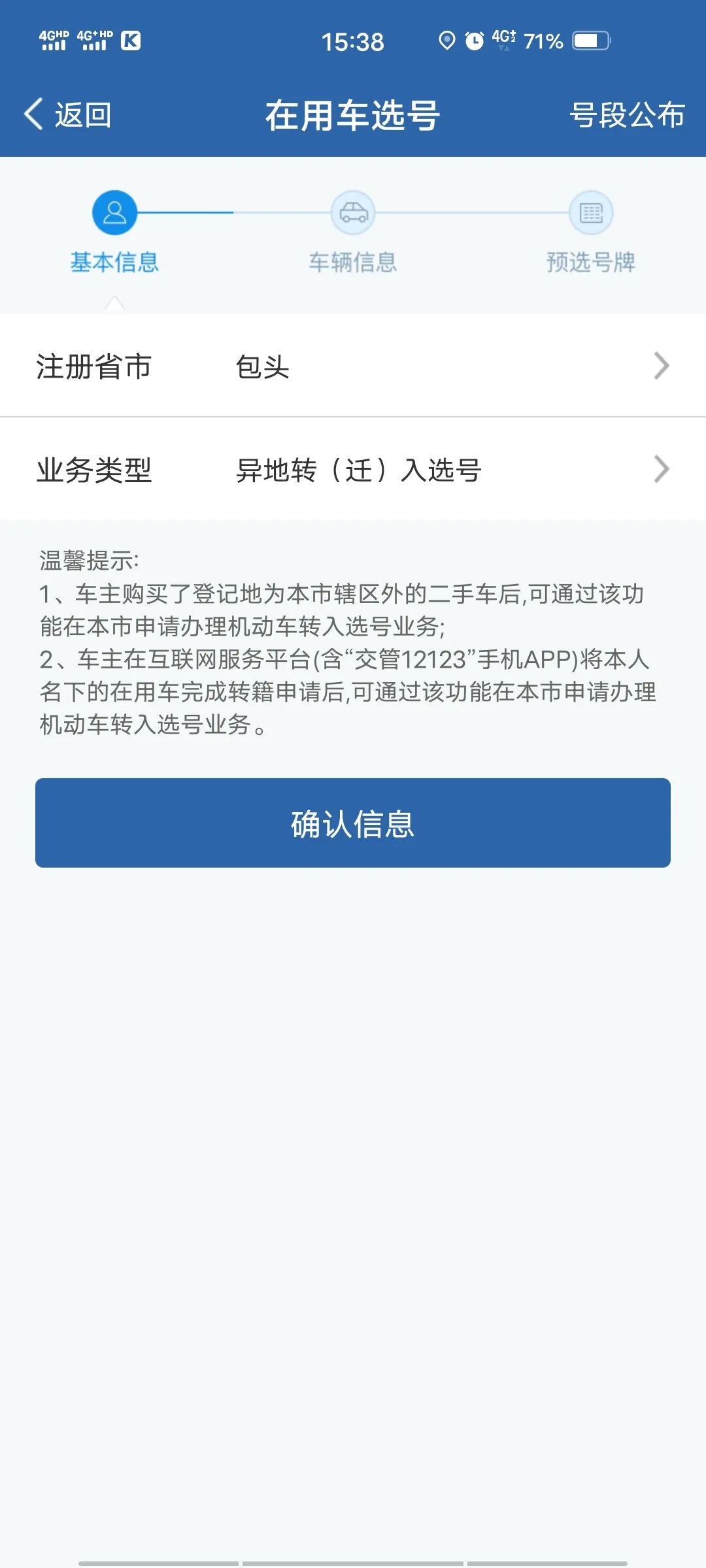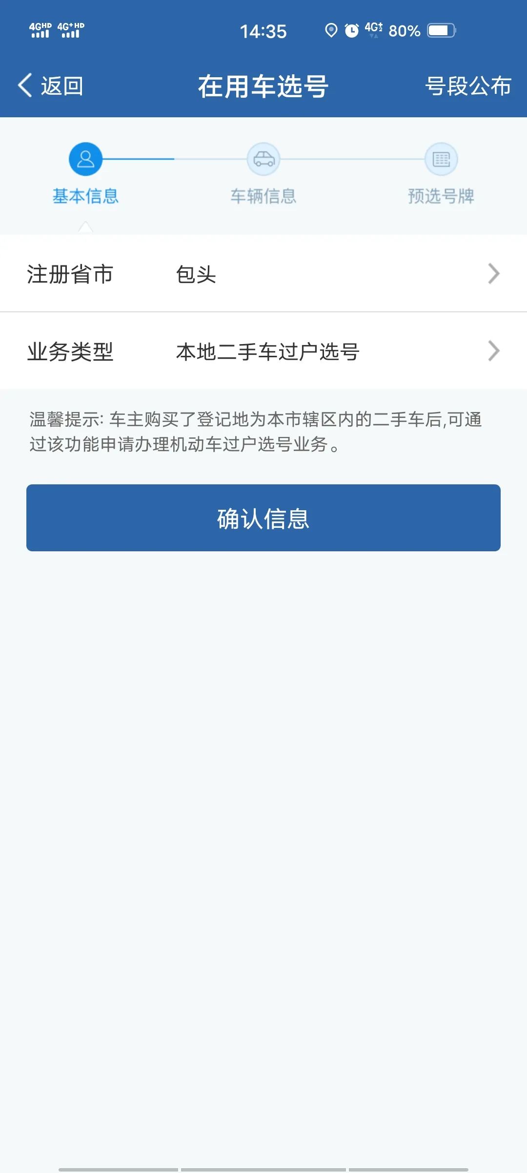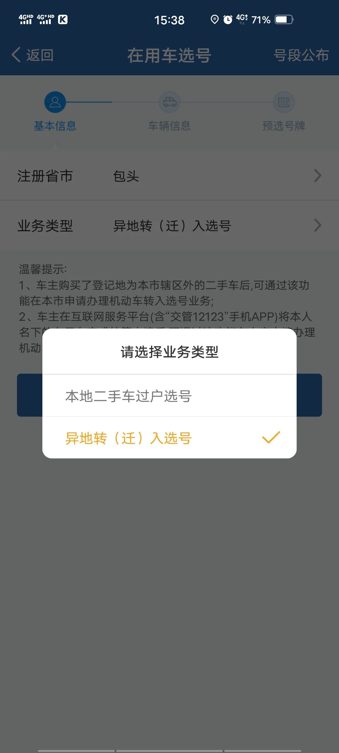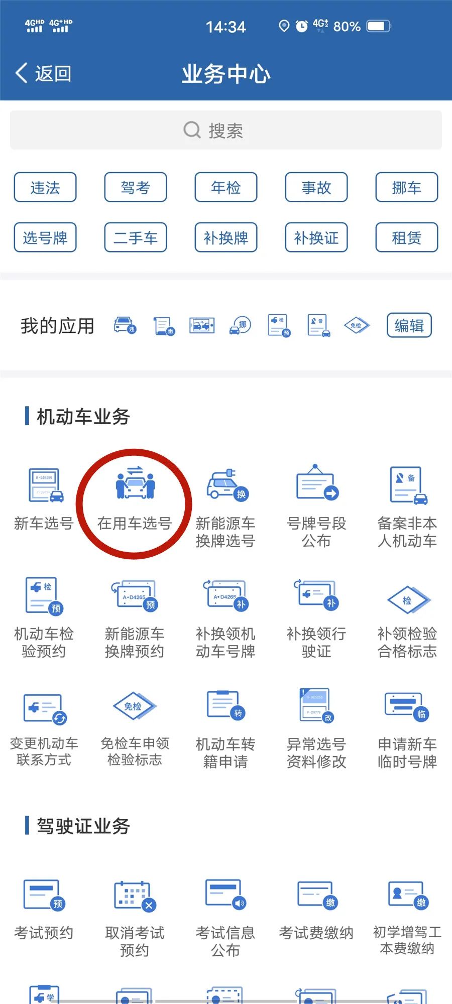 2、在用车选号:本地二手车过户选号、异地转(迁)入选号。