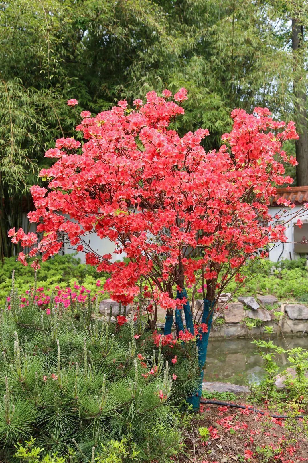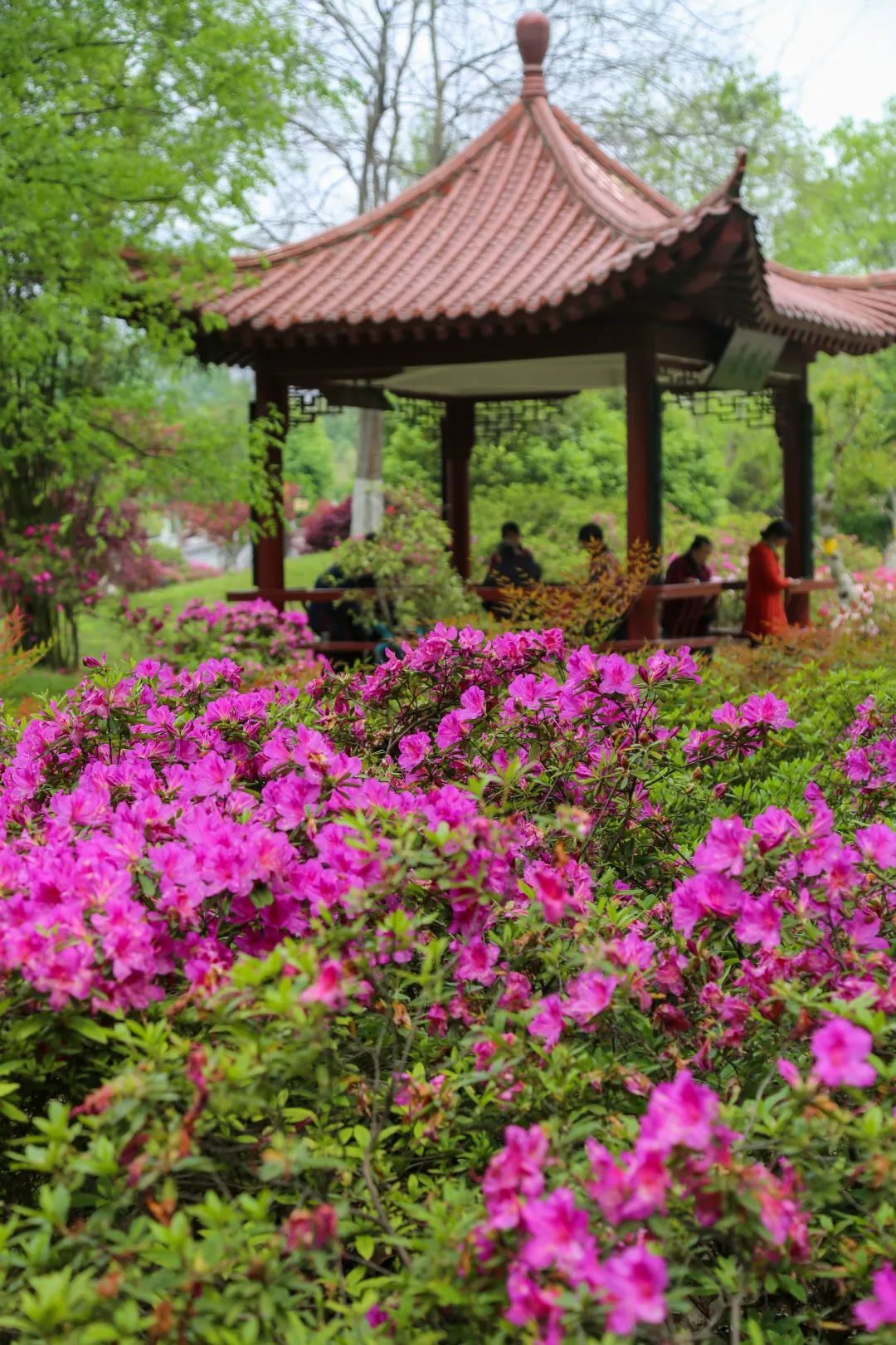 绕园一周,随处可见杜鹃花的倩影,要么独立成林,要么掩映在翠色之中,要么点缀在丽秋山、武丰河、楠姆河等自然地形地貌组合而成的山湖相依、廊桥亭榭、林泉石翠的传统生态景观中,甚是相得益彰。