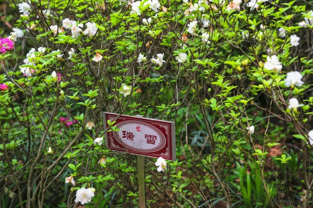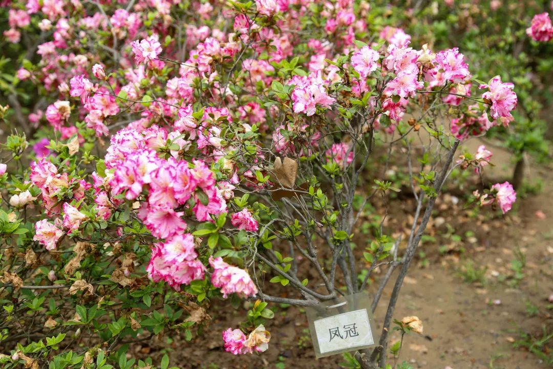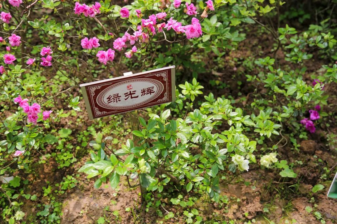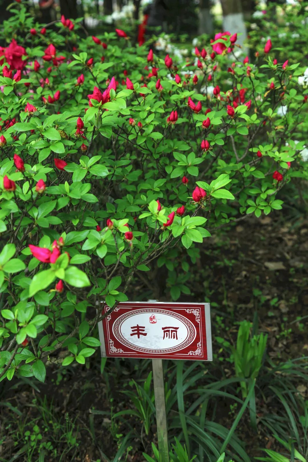 在一条条花径边安放了各类杜鹃的名牌。深红色五角星状的杜鹃是“劳动勋章”;洁白花瓣上点缀着紫红色条纹的杜鹃是“白佳人”;重瓣纯紫色的杜鹃是“幻境”;纯白花瓣绿色花蕊的杜鹃是“瑞雪”;镶有红色花边的杜鹃是“凤冠”……