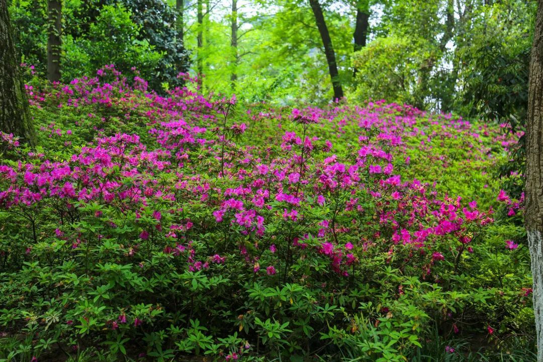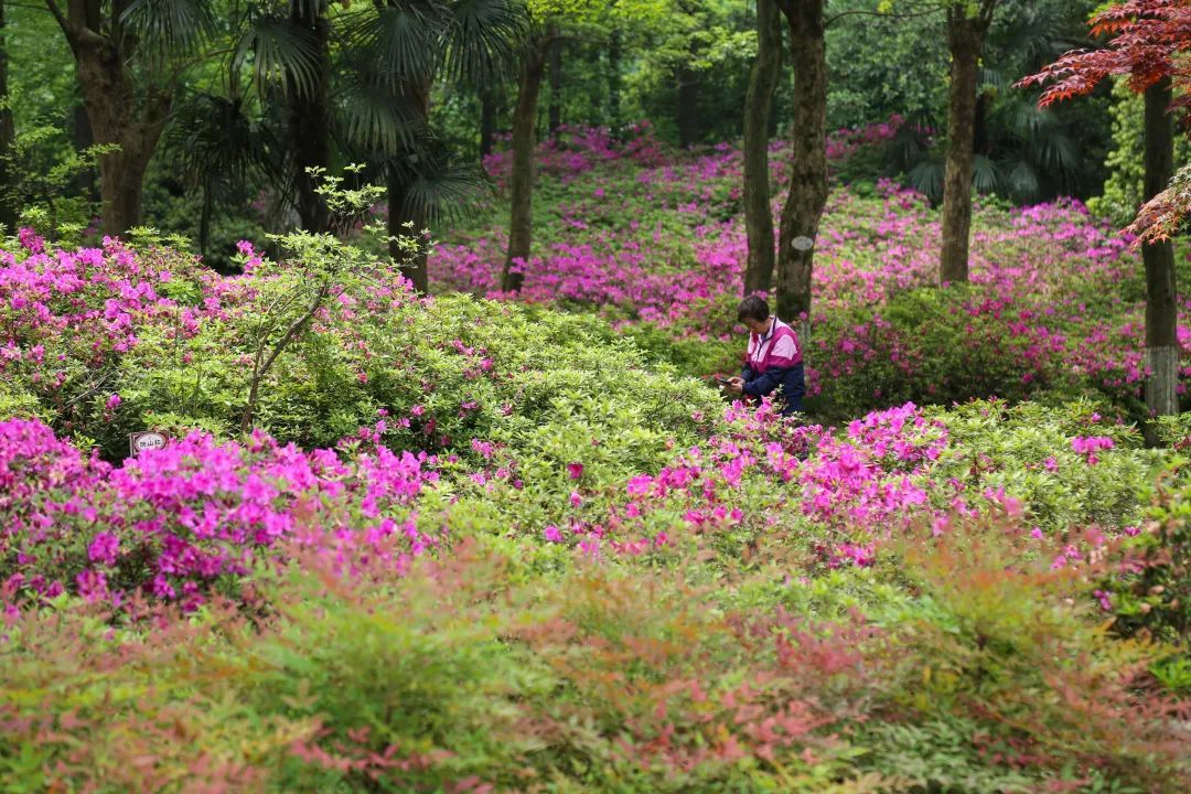 团团簇簇,娇艳欲滴,青山公园里的杜鹃花早已把公园渲染成大自然的“调色盘”。目前,70余种2万余株杜鹃正陆续开放,东鹃、毛鹃、夏鹃、西鹃和映山红五大类杜鹃齐聚园中,占地3万余平方米。今年青山公园还引进了粉丝带、红皇冠等新品种杜鹃,一年中花开春秋两季。