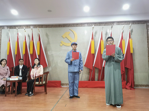 老河口市纪委监委组织纪检监察干部在该市市委党校进行党史专题学习,图为纪检监干部在学习间隙表演党史教育情景剧。(襄阳市纪委监委)