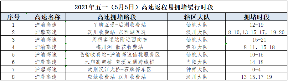 预计4月30日15至21时、5月1日9至12时出现出程高峰,5月3日、4日16至20时,5月5日13至20时出现返程高峰,环武汉周边、主干高速互通、服务区路段、景区相接的高速收费站易出现严重拥堵。