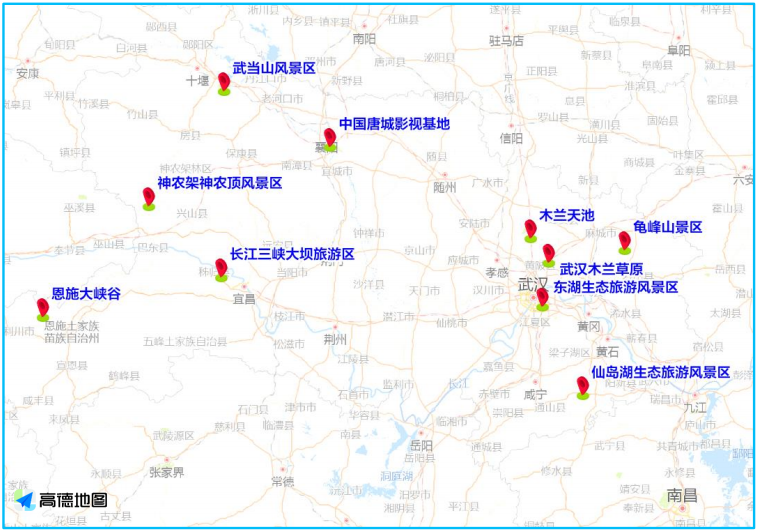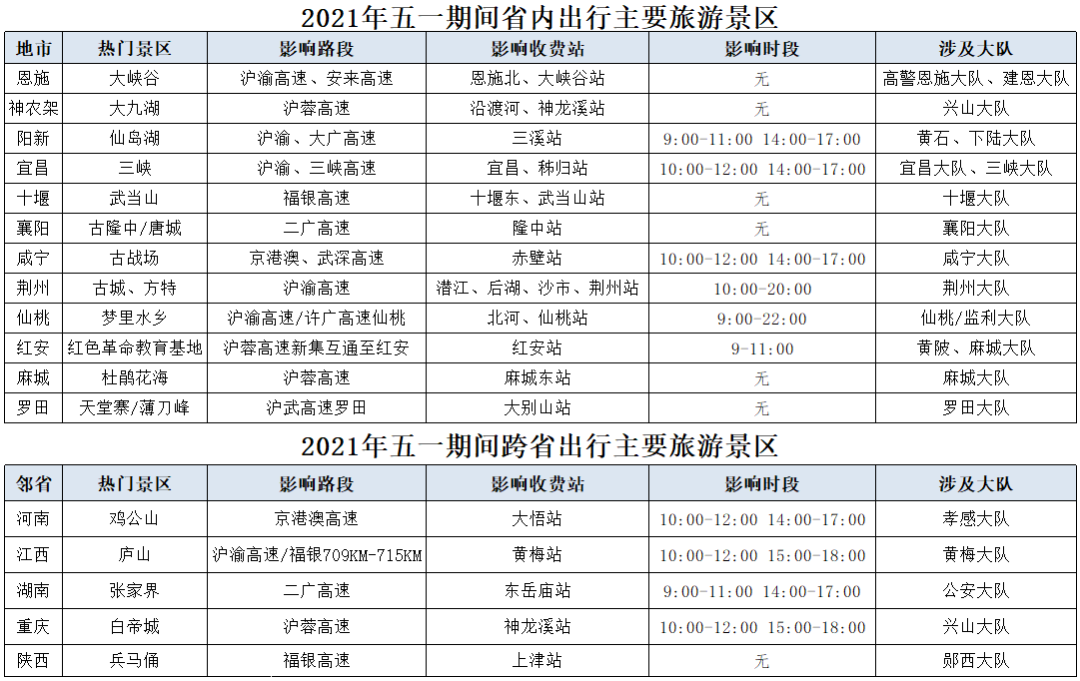 节日期间武汉市木兰草原、东湖生态风景区等周边部分路段;外交部重点推荐的湖北恩施大峡谷、神农架大九湖、阳新仙岛湖等景区;学党史红色主题旅游如红安革命教育基地预计也将成为热门;此外小长假跨省游也成为出行主力。