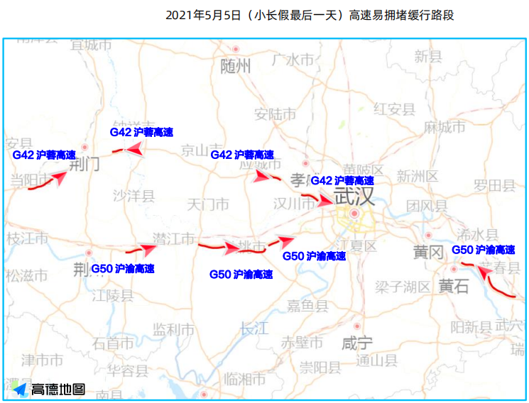 五一期间湖北省返程5月5日(小长假最后一天)易拥堵缓行的高速主要是G50沪渝高速、G42沪蓉高速的部分路段;建议行驶到以下路段的车主时刻注意路况,及时躲避拥堵。