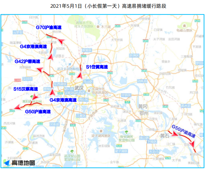 五一期间湖北省出程易拥堵缓行的高速主要是G50沪渝高速、S15汉蔡高速、G4京港澳高速、S1岱黄高速等高速的部分路段;建议行驶到以下路段的车主时刻注意路况,及时躲避拥堵。