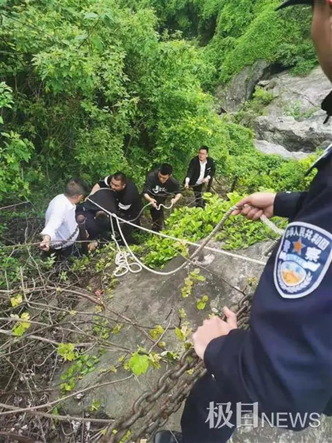 救援人员慢慢将小陈抬到一处斜坡,用绳索固定在其腰间,由斜坡下的工作人员托举着,斜坡上的民警和工作人员奋力将他拉了上来。简单检查小陈没有严重外伤后,民警和景区工作人员不敢耽搁,立即用担架抬着他下山就医。