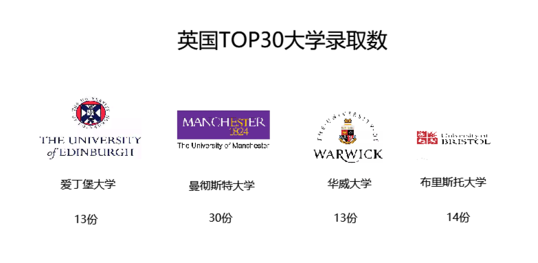 英国Top30大学录取数:爱丁堡大学录取13份,曼彻斯特大学录取30份,华威大学录取13份;布里斯托大学录取14份等。