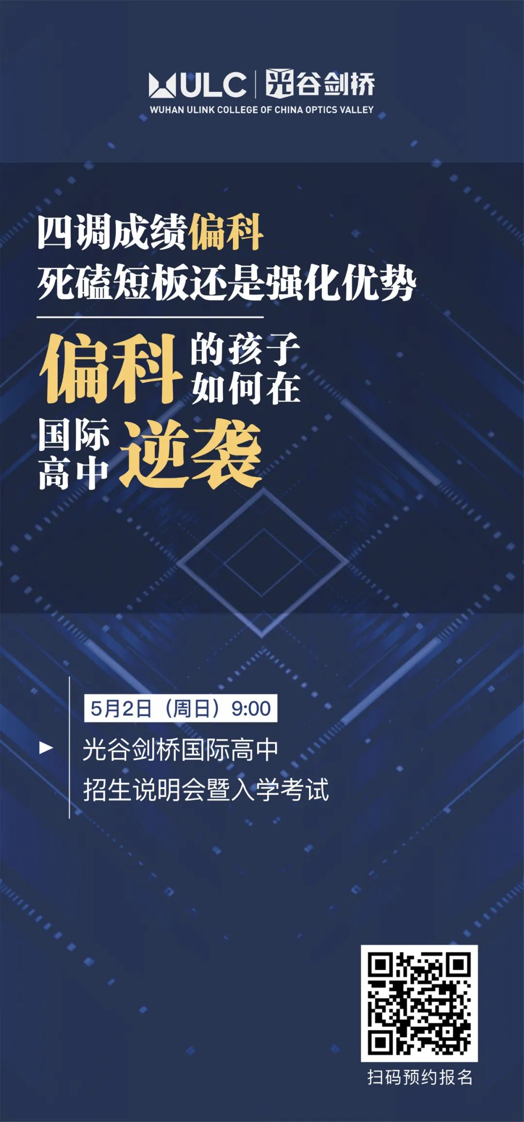 有关武汉市初三应届毕业生四调成绩偏科和报考国际高中相关问题,光谷剑桥即将在5月2日(周日)上午9:00,召开招生说明会。感兴趣的家长,可以扫描海报中的二维码进行报名噢。