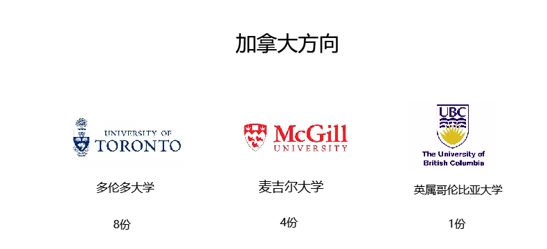 截止4月26日,加拿大Top3大学录取数:加拿大医博类排名第二的多伦多大学录取8份,加拿大医博类排名第一的加拿大麦吉尔大学录取4份,加拿大医博类排名第三的英属哥伦比亚大学录取1份。