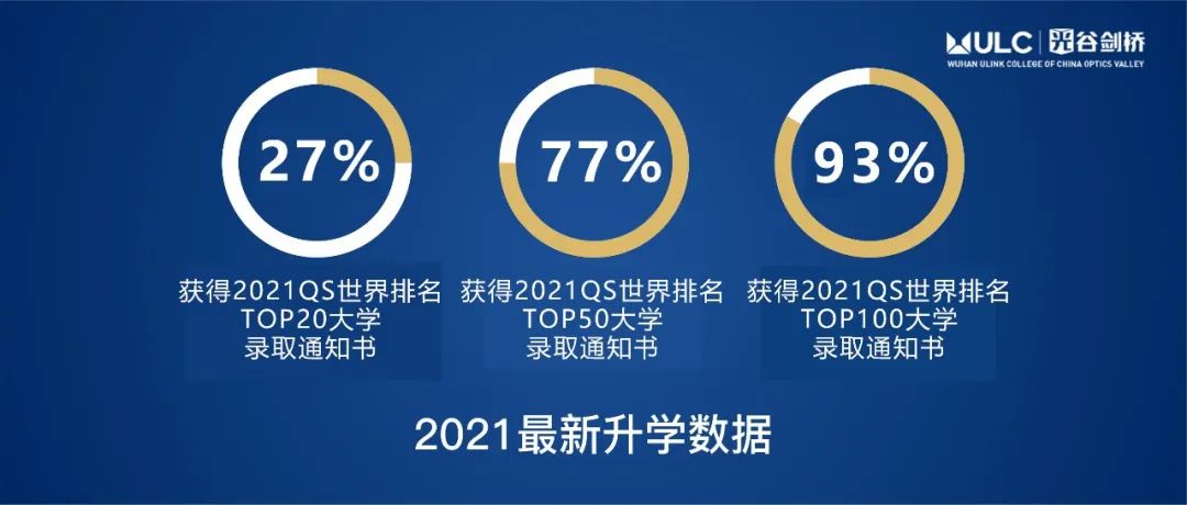 截至4月26日,光谷剑桥国际高中2021届准毕业生中,根据权威的QS世界大学排名榜,已有14%的学生被全球排名TOP10大学录取,27%的学生被TOP20大学录取,77%的学生被TOP50大学录取,93%的学生被TOP100大学录取(上述数据中被英国大学录取的毕业生为预录取)。