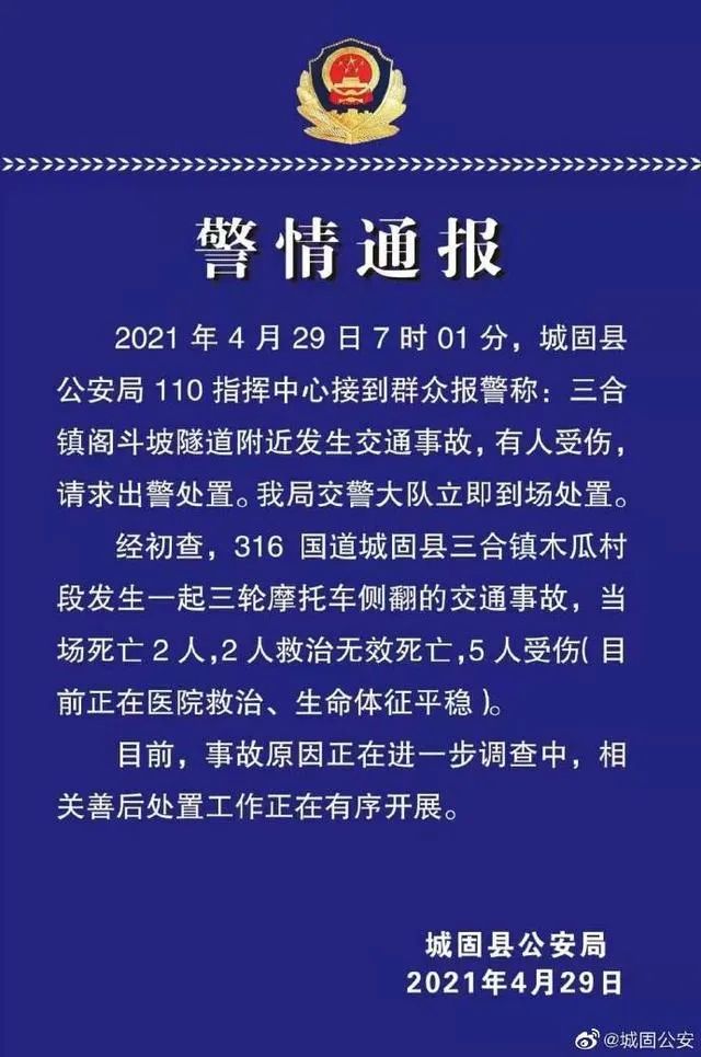 经初查,316国道城固县三合镇木瓜村段发生一起三轮摩托车侧翻的交通事故,当场死亡2人,2人救治无效死亡,5人受伤(目前正在医院救治、生命体征平稳)。