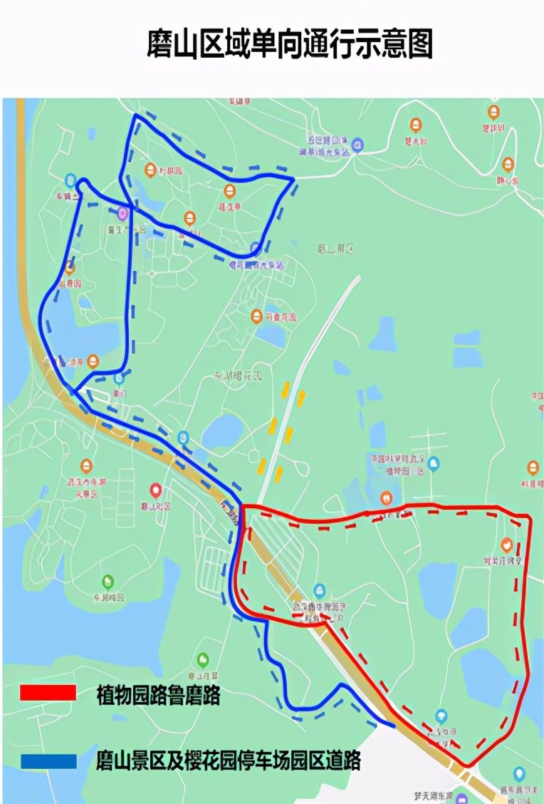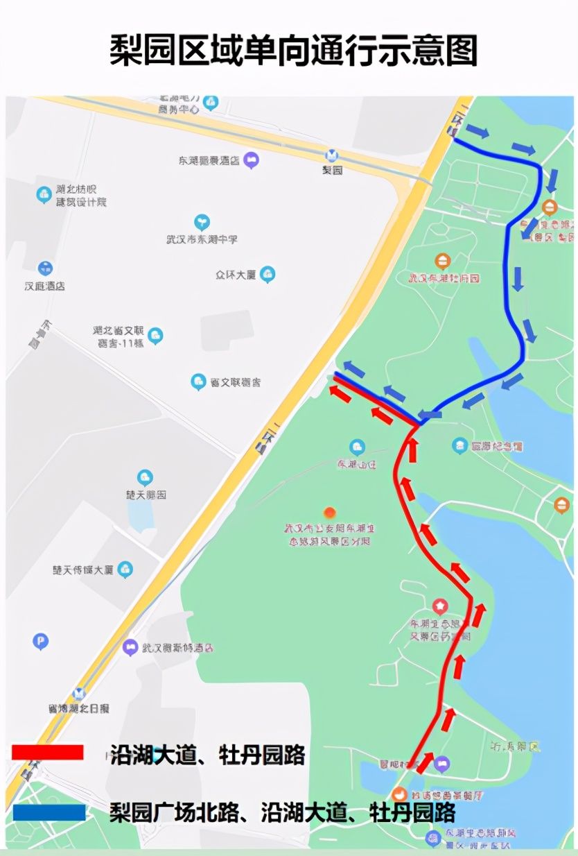 二、5月1日至5日,每日9:00-17:00,磨山区域(鲁磨路团山路路口→东湖通道鲁磨路地面层→东湖隧道管理公司→鲁磨路植物园路路口→中科院武汉植物园→植物园路团山路路口方向)、梨园区域(梨园广场北路→沿湖大道→牡丹园路→二环线东湖路辅道方向)、武昌路南向北,实施机动车单向通行。