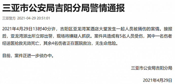 2021年4月29日13时40分许,三亚市吉阳区亚龙湾某酒店大堂发生一起人员被捅伤的案情。接报后,亚龙湾派出所立即出警,现场将嫌疑人抓获。案件共造成有5名人员受伤,其中一名伤者经送医抢救无效死亡,其余4名伤者正在医院救治,无生命危险。