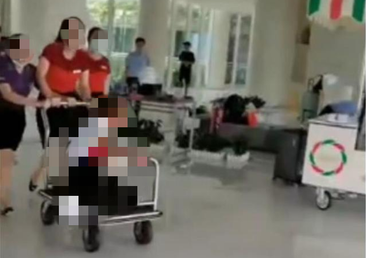 网传视频显示:在一酒店大堂,有人喊着“报警”、“快点跑”,还有人打车离去,几位酒店工作人员将胸前是血的伤者运到大堂外。